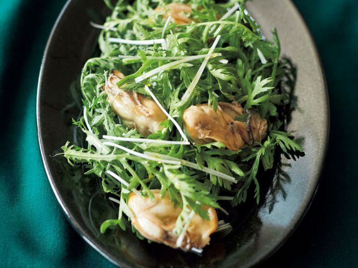 春菊の葉1/2わ分としらがねぎ5cm分は冷水にさらし、水けをきる。オイル漬けのかき4個をのせ、オイル適宜をかける。