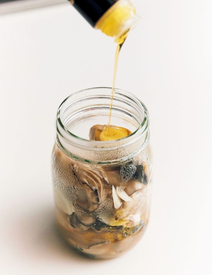 煮沸消毒をした保存びんにかきを入れ、残った蒸し汁を注ぐ。にんにくを加え、オリーブオイルをかぶるまで注ぐ。