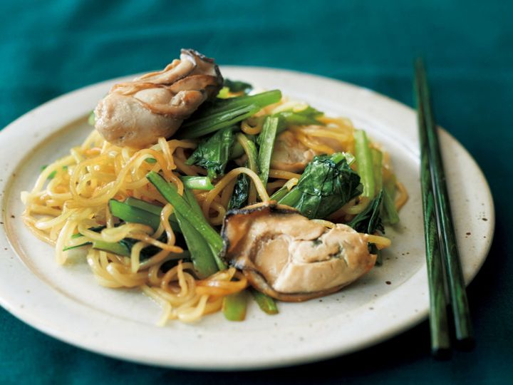 小松菜4株は葉と茎に分け、長さ4cmに切る。茎をオイル漬けのオイル大さじ1でさっと炒め、いったん取り出す。中華蒸し麺2玉を炒め、オイル漬けのにんにく2枚と茎を加え、しょうゆ少々をふる。かき6個と葉を加えてさっと炒める。