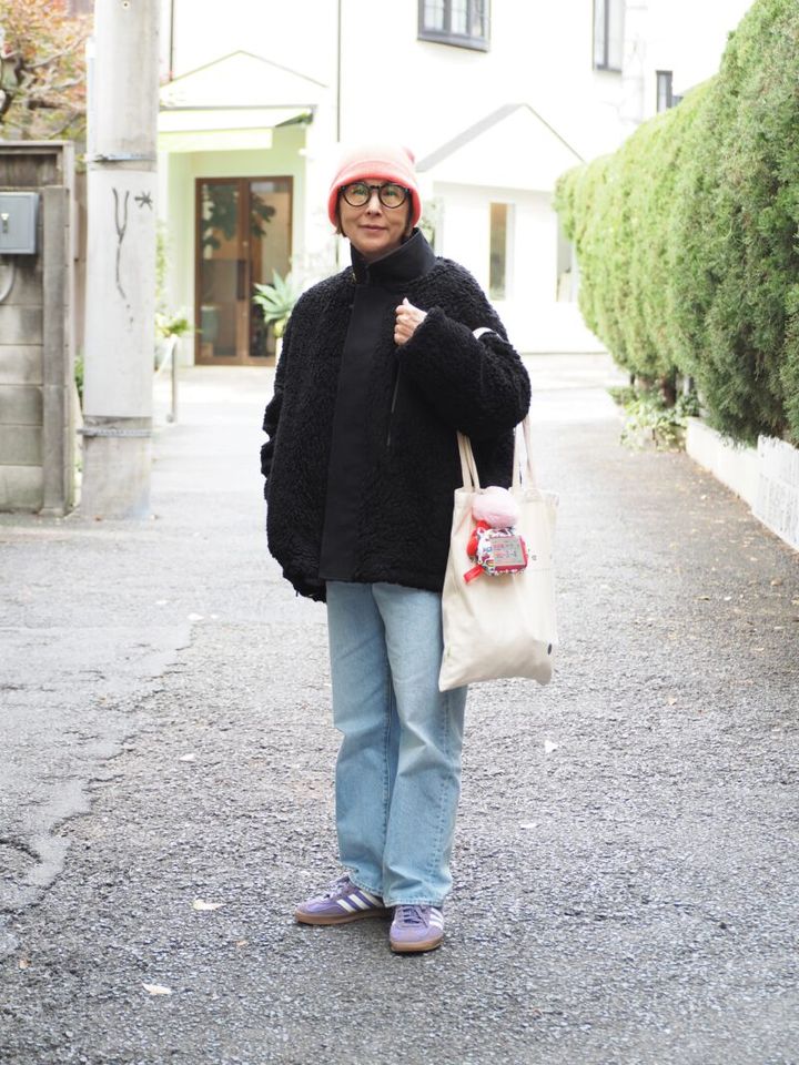 太めのストレートデニムとボアアウターというカジュアルな出で立ちがお似合いの森本さん。ピンクのニット帽とパープルのスニーカーで色みを取り入れて、ポップなストリートスタイルに。「小物だけでも明るい色にすると、元気が出るような気がします」