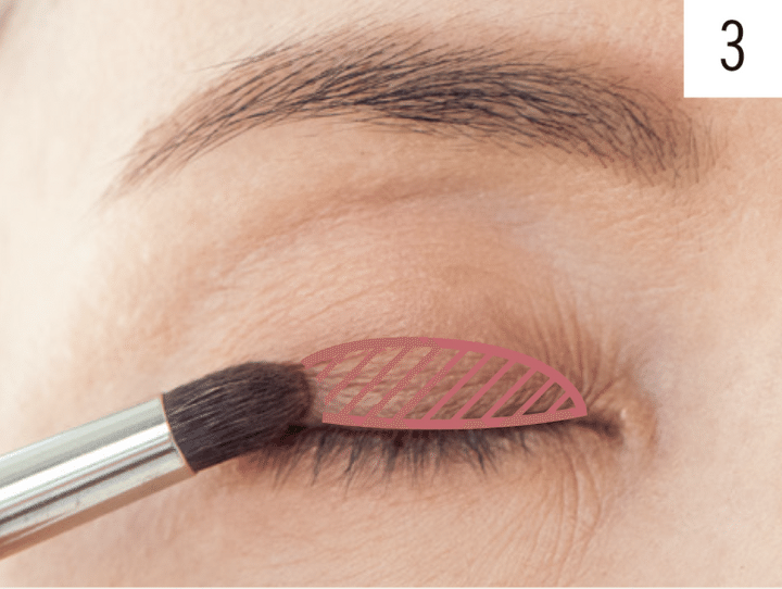 使用パレットのダークブラウン(下段真ん中)をアイホールの下半分にのせ、まぶたを引き締めます。