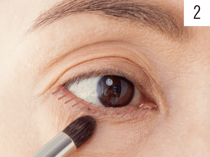 涙袋(笑ったときに出る部分)にも①と同じカラーをのせて目を大きく見せます。