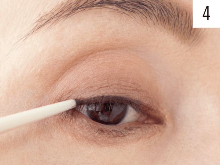ダークブラウンのペンシルで目頭から目尻まで、まつ毛の根元を埋めるようにアイラインを入れます。粘膜が見える場合は、内側にも入れて。