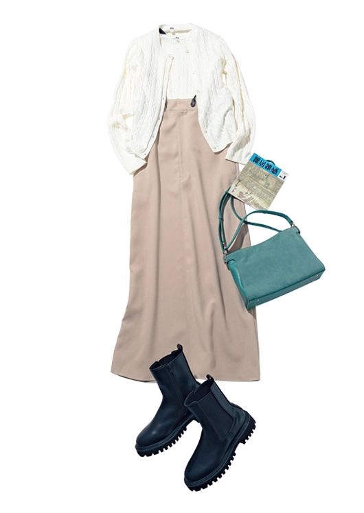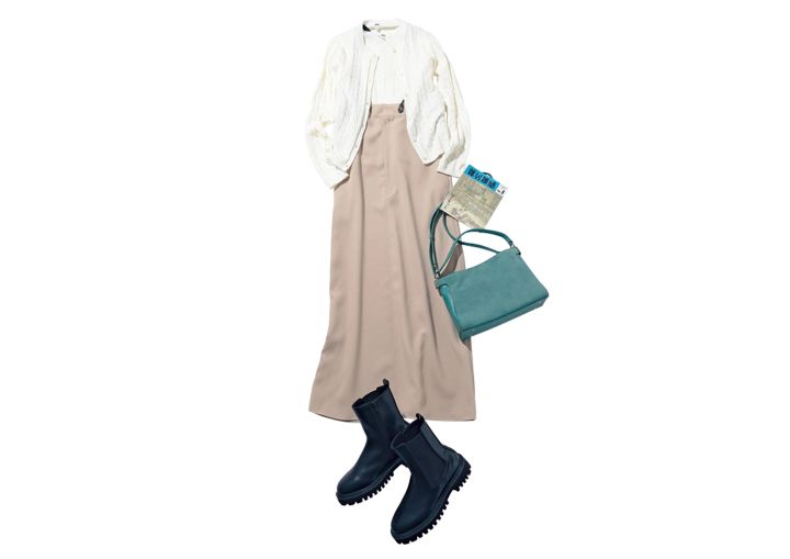 サスペ付きジャンスカ¥24,200/リエル リシェ カーディガン¥3,990、ニット¥2,990/ともにUNIQLO グリーンバッグ¥39,600/銀座かねまつ(銀座かねまつ6丁目本店) ショートブーツ¥15,000/PLST