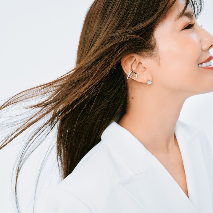 バックドレープジャケット¥29,700(TRESOR by lana) デニムパンツ¥35,200(upper hights/ゲストリスト) ピアス¥291,500 イヤーカフ各¥26,400 リング[右人差し指]¥319,000 リング[右中指、上]¥134,200 リング[右中指、下]¥165,000 リング[左]¥110,000 バングル¥52,800(すべてENEY/ENEY松屋銀座)