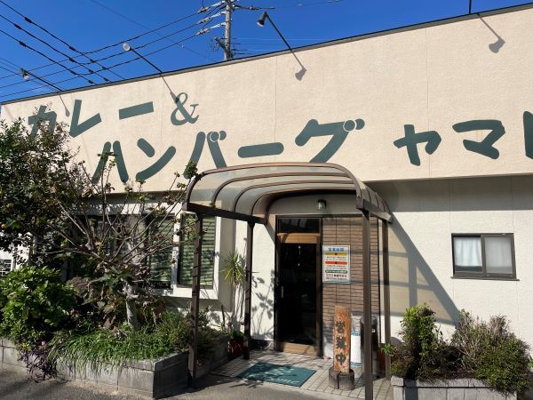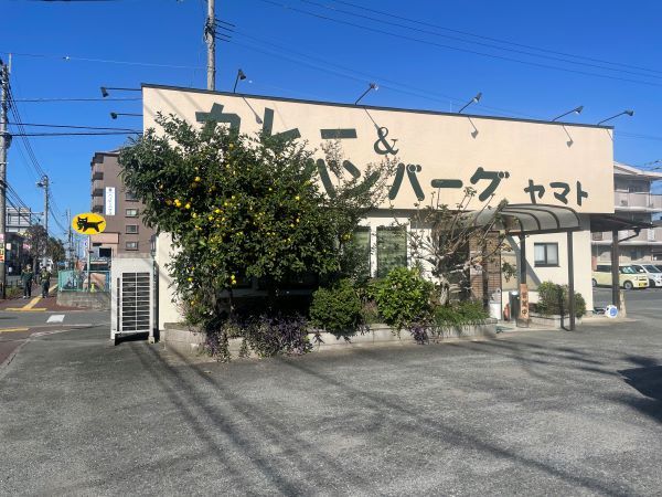 「中原三丁目」交差点を左折すると右手に「ヤマト」が現れます。 白い外壁の店舗の上方には、植物に一部隠れていますが「カレー&ハンバーグ ヤマト」と描かれています。 初めて見かけた時、運転中だったので凝視できず、隠れたところを含めあれこれ想像していました。もしかして「ハンペンバーグ」?