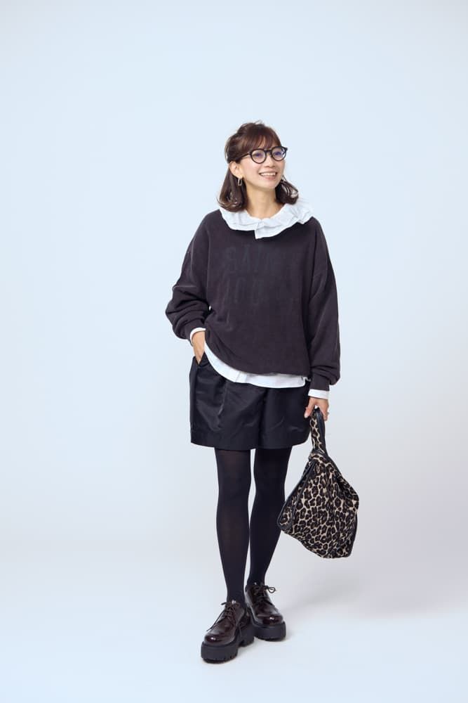 ボーイッシュに転びがちなスウェットにはフリルブラウスを合わせて甘い要素をプラス!同じブラウンの厚底ローファーとバッグで色味のトーンを合わせて、豹柄でアクセントをつけました。