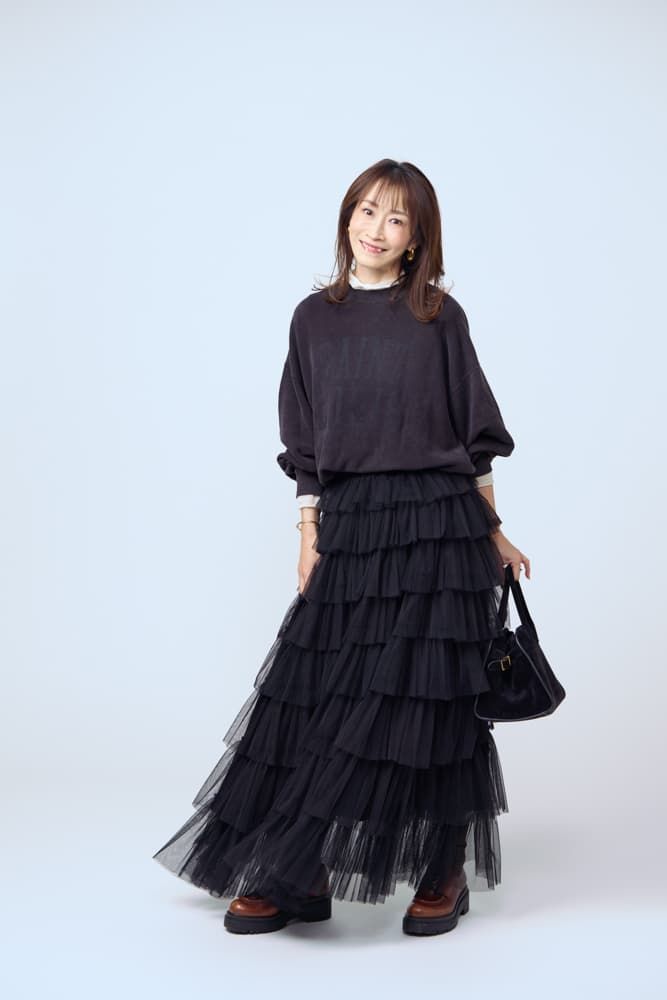 佐藤 私は、このチュール素材のフリルスカートに合わせたい!と思ってこのスウェットを買ったんだ。甘いスカートをカジュアルすぎず子供っぽくならないように着たくて。濃い色味のスウェットは白地のものよりも少し大人っぽく仕上がる気がする。