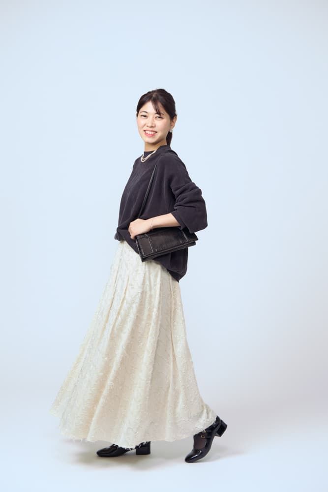 どうしても部屋着っぽくなってしまうので苦手なスウェットですが、フェザースカートとパールのアクセサリーを合わせることで攻略できました!ヘアアレンジを加え、メリージェーンなど甘めの靴を合わせるとバランスが取りやすかったです。