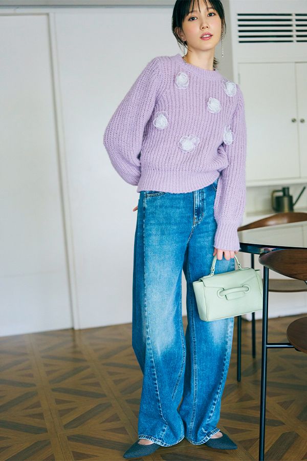 3. 休日ムードたっぷりのフラワーモチーフニットを、×ワイドデニムでほどよい甘さに〈11/23のコーデ〉