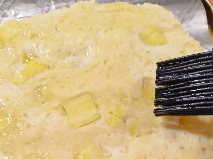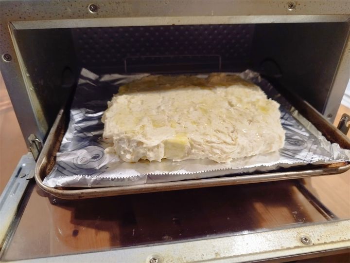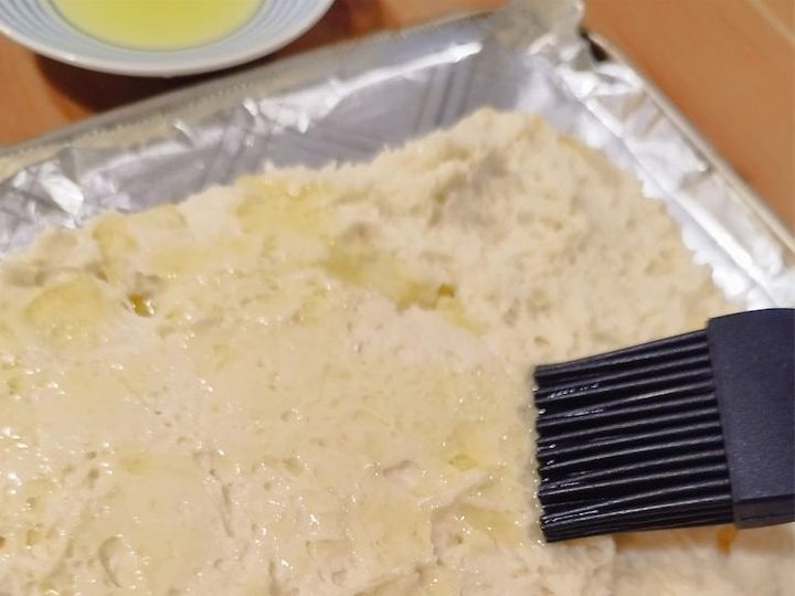 6.ラップを外し、アルミホイルの上に5の生地をのせて表面にオリーブオイルを適量塗り、1000Wのオーブントースターで5分加熱する。