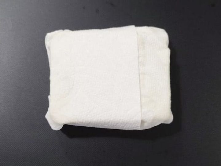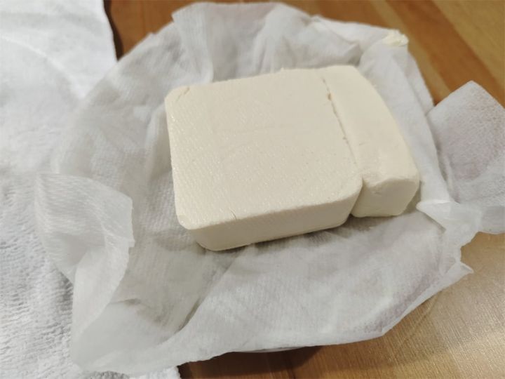 1.絹豆腐はキッチンペーパーにくるみ、重しをして軽く水分を取る。