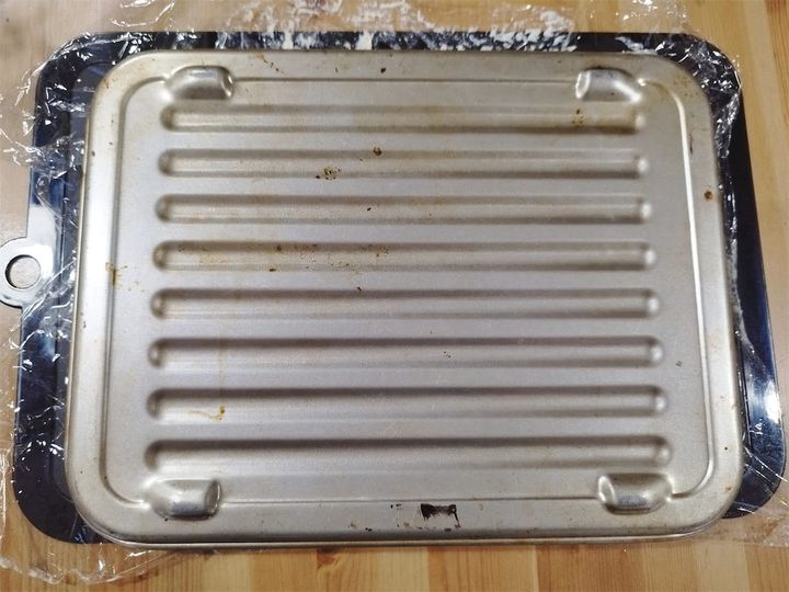 その上にアルミホイルを敷いたトースターのトレーをのせ、ひっくり返します。