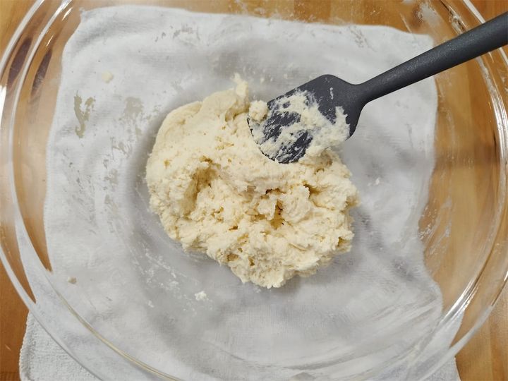 5.4の生地をラップで包み、厚み2~3cmになるように形を整える。