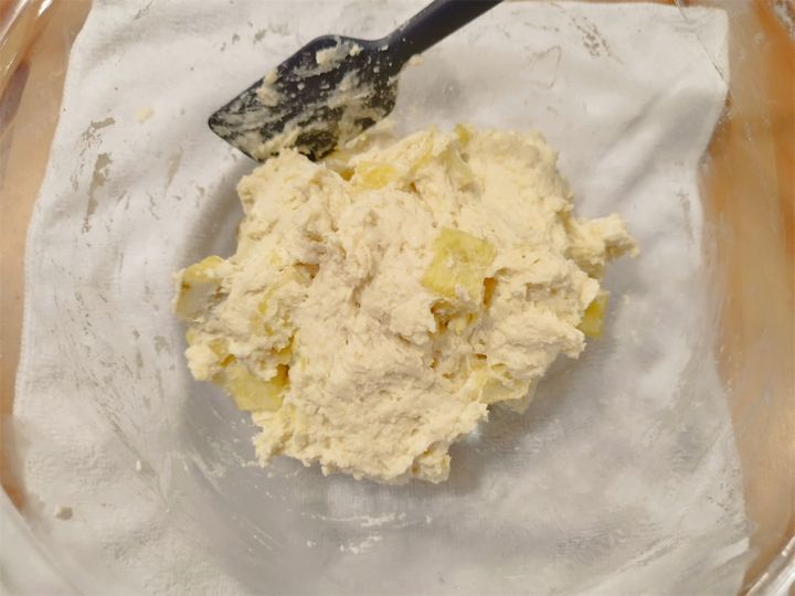 3.ボウルにホットケーキミックス、1の水切りした絹豆腐を入れ、よく混ぜ合わせる。