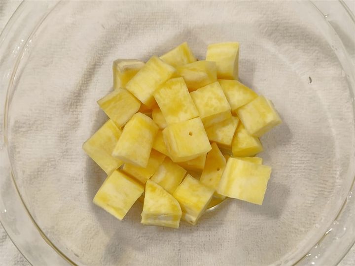 2.さつまいもは皮を剥いて2cm角くらいに切り、耐熱容器に入れてふんわりラップをして、500Wの電子レンジで3分加熱する。