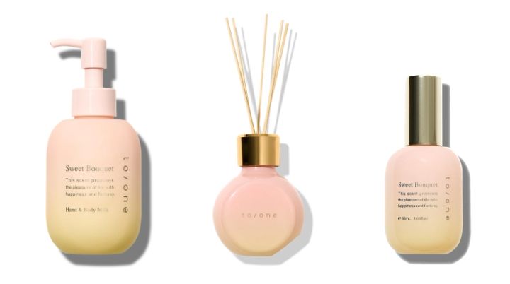 左から【to/one】スウィート ブーケ ハンド&ボディミルク 150mL ¥3,520【to/one】スウィート ブーケ ディフューザー 100mL ¥4,950【to/one】スウィート ブーケ オードトワレ 30mL ¥4,950