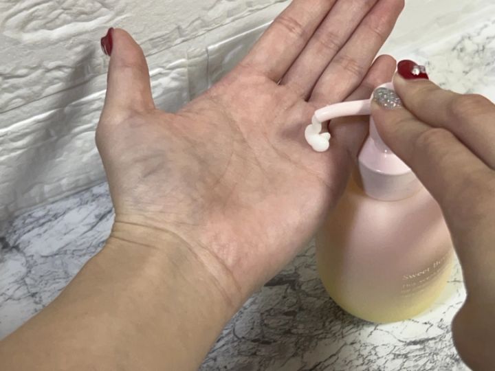 「パステルピンクとクリーム色のパッケージが本当にかわいいですね。文字もゴールドで部屋に置いていても高級感が出ます。ポンプ式なので、片手でもサッと使うことができて楽でした!」