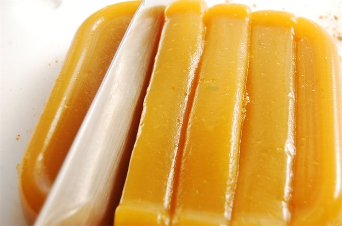 8. まな板の上にきな粉を振り、7を容器から取り出します。容器とわらび餅の境をナイフなどで剥がすと、取り出しやすいそうです。