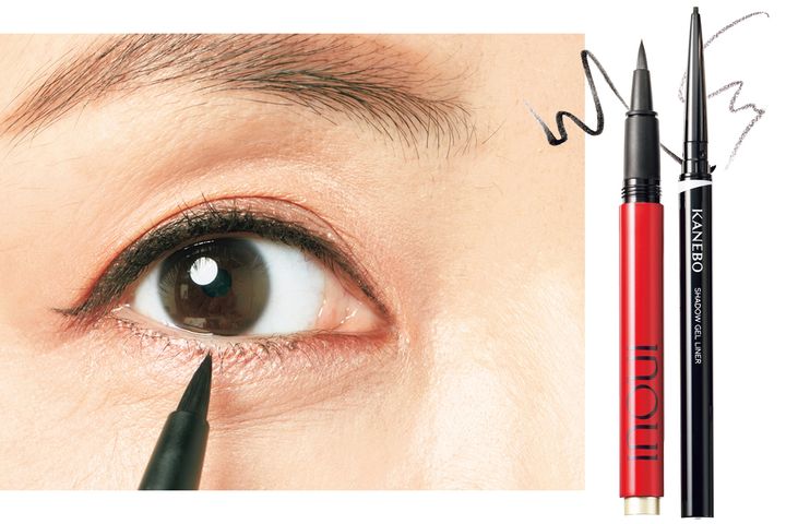 隙間を埋めやすいジェルライナー。赤、黄、黒、白をベースに青を加え、くすまず肌が冴える色設計。カネボウ シャドウジェルライナー SG1 ¥3,520(カネボウインターナショナルDiv.)黒目を引き立てるナチュラルブラック。コシのあるブラシで自在に。インウイ アイライナーリキッド 01 ¥4,400(資生堂)