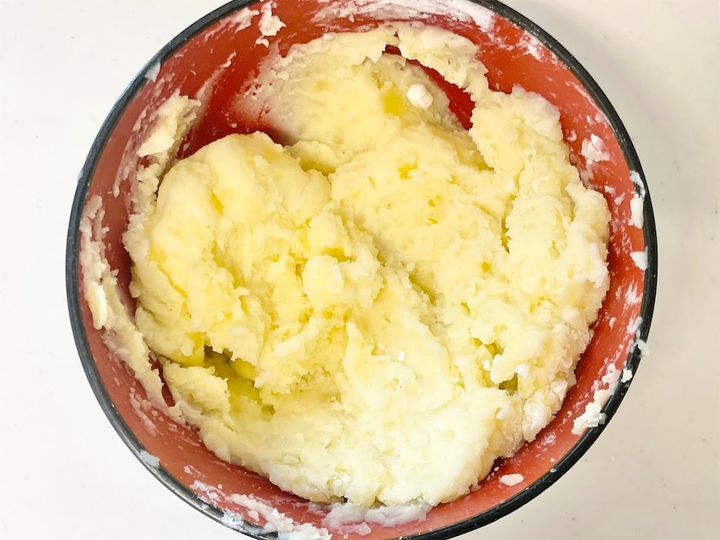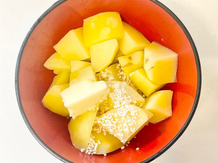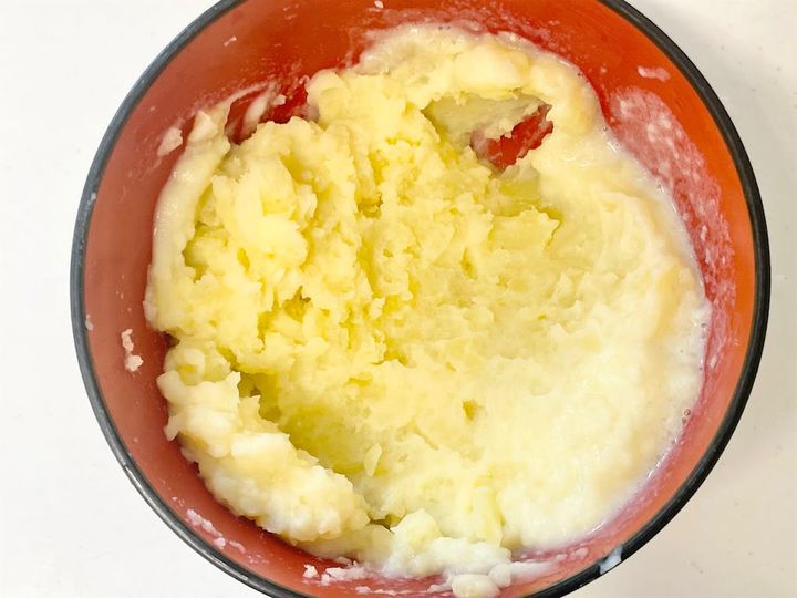 2. じゃがいもが温かいうちにバターと鶏ガラスープの素を加えて、なめらかになるまでつぶしながら混ぜます。