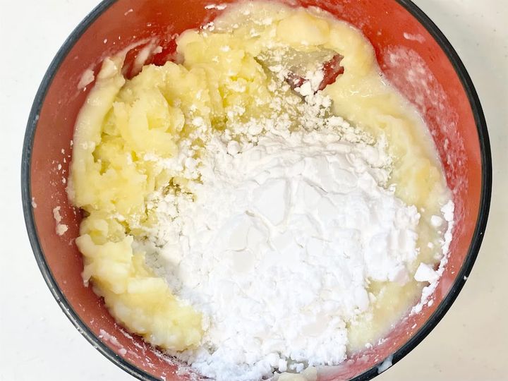 4. 片栗粉を入れて粉っぽさがなくなるまでつぶしながら混ぜます。ひとまとまりになるまでよく混ぜて、ラップをして粗熱をとっておきます。
