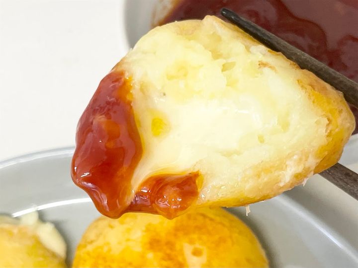 このままでも十分おいしいですが、ソースをつけると甘辛くなって味わいが変わりました。