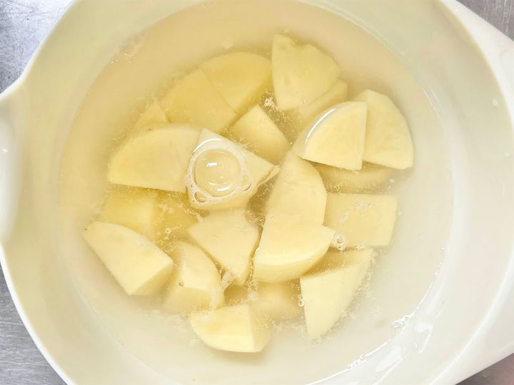 1. じゃがいもの皮を剥き、芽がある場合は取り除いて、ひと口大に切り、5分ほど水に浸します。