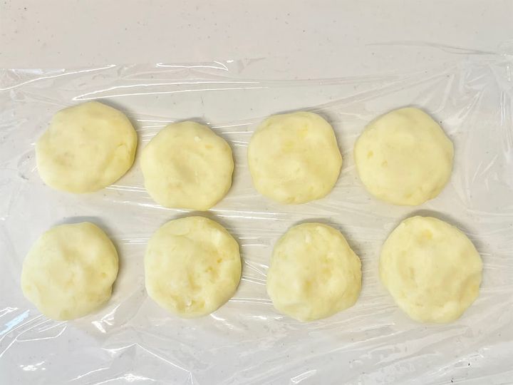 5. 4の粗熱が取れたら、手のひらに大さじ1強くらいをとり軽く丸めて、広げます。そこにスライスチーズを半分に折って、それをまた半分に折り曲げ、真ん中に置きマッシュポテトを作っていきます。空気が入らないように形を整えます。同じように繰り返し作っていきます。