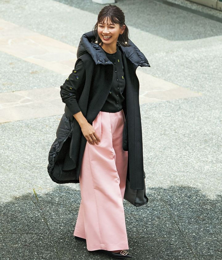 『このベストは前がウール後ろがダウンの異素材ミックス。キレイめにもカジュアルにも着こなせる万能さにキュン♡ピンクパンツに合わせて旦那とドライブに行きたいです。』