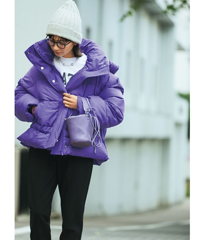 『スポーツ観戦用に元気が出るパープルのダウンをチョイス。移動は車が多いので、短すぎずお尻が隠れる丈感を選んで防寒もバッチリ。ネックレスでカジュアルムードを引き締めるのがポイント。』