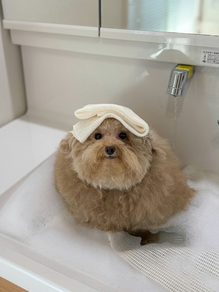 頭の上に乗せたタオルがお風呂っぽさを醸し出してかわいいですよね。そしてなんといってもまんまるの毛並み!ふわっふわのボリューム感は、プードルを知っている方でもびっくりするような大きさではないでしょうか。