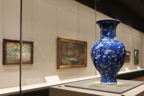 手前、《青華氷梅文花瓶》 初代宮川香山 明治27年(1894) 日本美術協会春季美術展覧会 二等賞銀牌受賞、ほか「皇室の美術振興-日本近代の絵画・彫刻・工芸」展示風景 すべて皇居三の丸尚蔵館収蔵