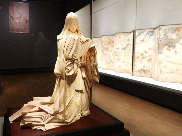旭玉山(あさひぎょくざん)の牙彫(げちょう)の傑作《官女置物》(手前)。
