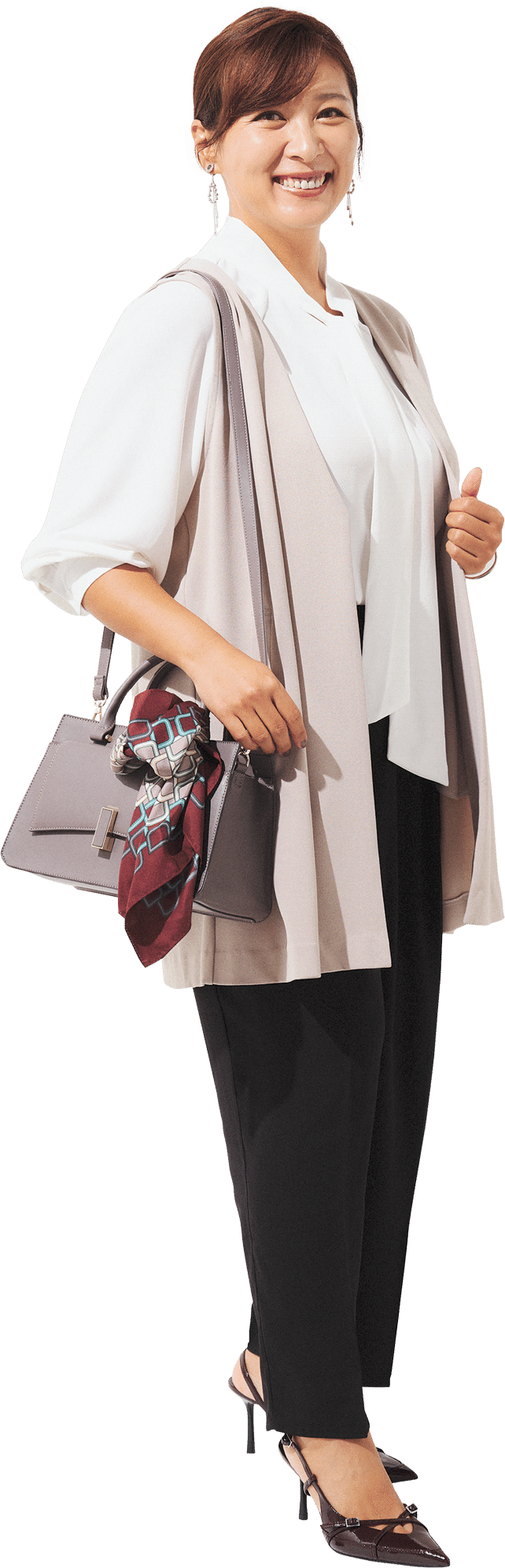 ジレ ワンサイズ ¥9,990/エウルキューブ リボンタイ付きブラウス L~10L ¥4,389~¥4,939/スマイルランド ダブルインタックパンツ 3L~5L ¥3,630/クレット イヤリング ¥3,960/コトモノマルシェ ルミネエスト新宿店 ブレスレット 各¥330/ラティス 2WAYバッグ ¥13,200/ジュエルナローズ新宿ミロード店 バッグに付けたスカーフ ¥14,300/ニューヨーカー(ダイドーフォワード) ポインテッドトゥバックストラップパンプス 35~42 ¥5,990/ZARA(ザラ カスタマーサービス)