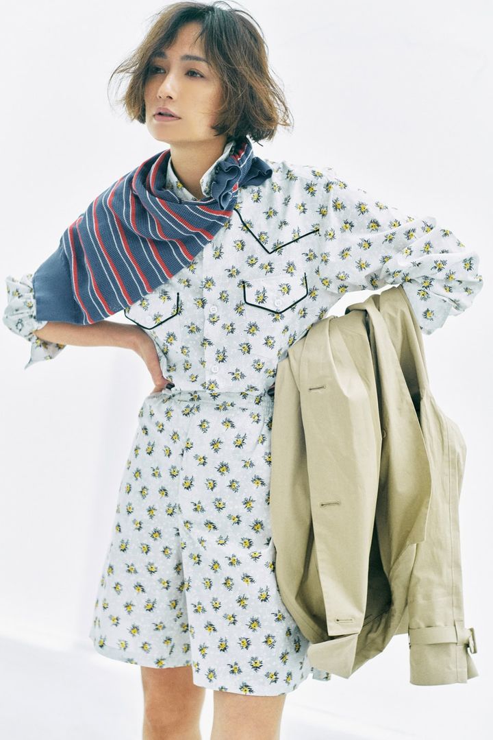 「織り模様入りの生地に甘さをおさえた花柄がプリントされた、表情豊かなセットアップ。ウエスタンテイストのバランスが絶妙。ショールのように巻いたのはポロシャツ。色を差して遊び心を。肩の力が抜けたカジュアルスタイルなのにユル過ぎないのが好き!」(加藤さん)