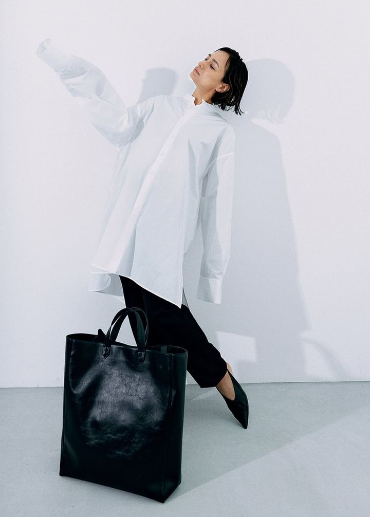 「オーバーサイズながら、袖ぐりがすっきりとしたフォルムなので、華奢な女性でもキレイに着こなせるホワイトシャツが主役。あえて他をブラックでまとめ一番取り入れやすいスタイルに。バッグもラージサイズで全身のバランスを。絶妙なサイジングと質感だからこそ決まるルックです」(加藤さん)