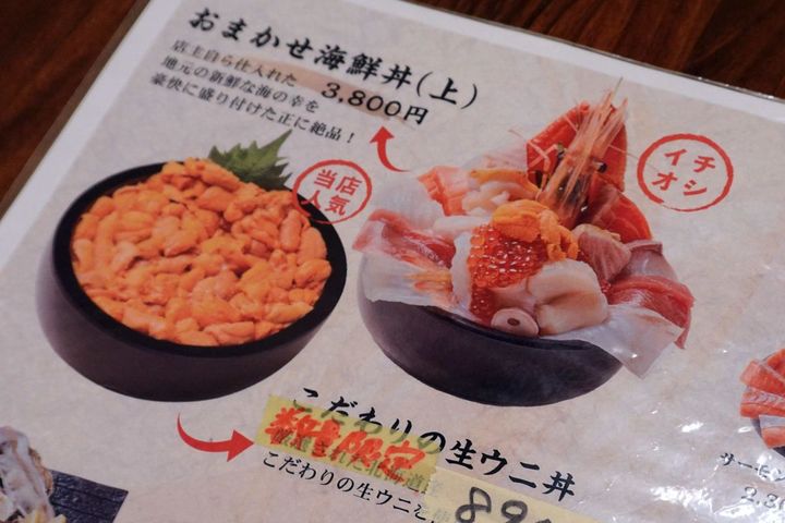 肝心のメニューはというと、鉄板人気の「おまかせ海鮮丼」をはじめ、「生ウニ丼」や「いくら丼」、「タラバ丼」など20種類以上。「お腹いっぱい食べていってほしい」と、丼から溢れんばかりのネタが乗った海鮮丼は男性でも大満足のボリュームです。