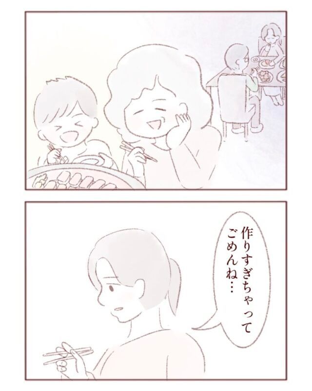 義母と浩二さん家族が美味しそうにお寿司を食べる様子を眺めながら、夫と2人で私が昼に作った料理を食べていました。「作りすぎちゃってごめんね」2人では食べきれない量のおかずを目の前に、私は夫に言いました。