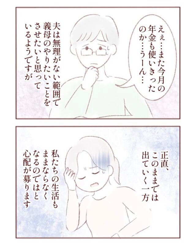 夫に相談すると、困ったように「また今月の年金も使いきったのか」と考え込みました。夫としては、無理のない範囲で義母のやりたいことをさせたいと考えているようですが、正直このままでは出費がかさみすぎて私たちの生活がままならなくなるのではないかと心配になります。