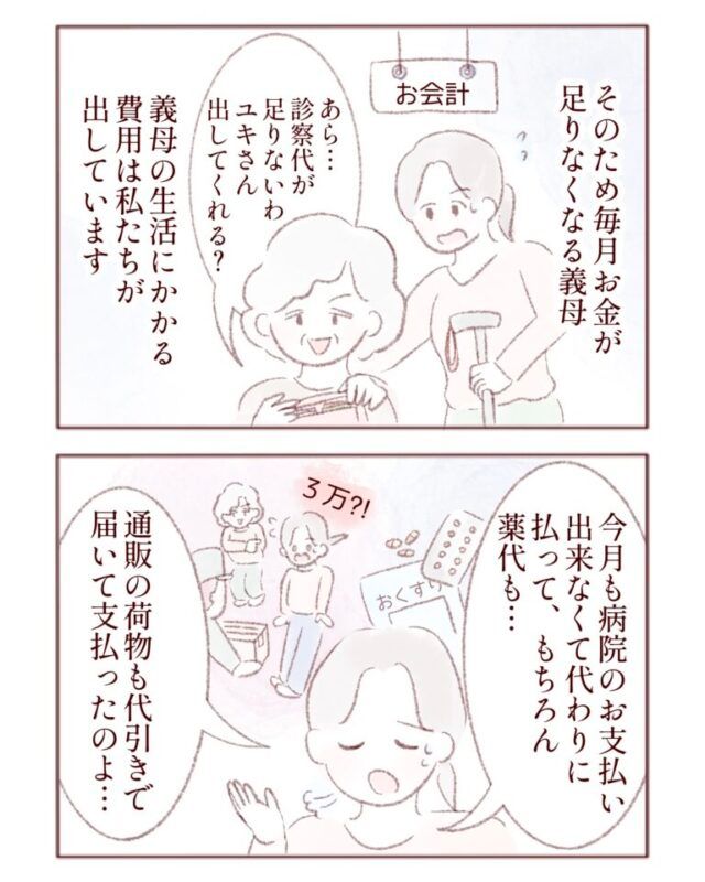 浩二さんのための義母が散財するため、当然毎月の年金を使いきりお金が足りなくなります。そうなると、義母の診察費、薬代、それに高額な通販の代引きを支払うのは私です。