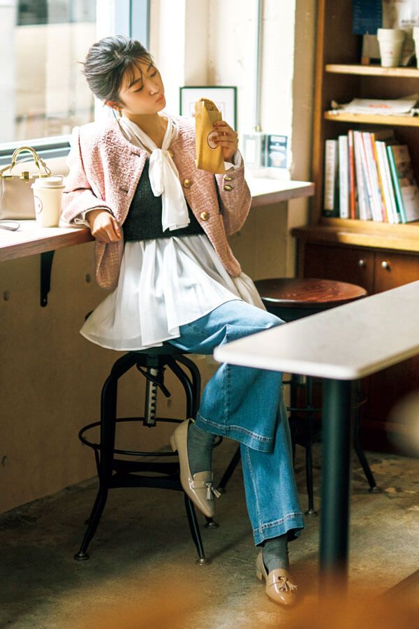 ベスト[ブラウス付き]¥19,800/SNIDEL ジャケット¥30,800/アプワイザー・リッシェ パンツ¥19,800/ストラ イヤリング¥8,800/カリーヌサルタン(ココシュニック新宿タカシマヤ店) バッグ¥148,500/ザンケッティ(エリオポール代官山) ソックス¥1,320/17°C(17°C by Blondoll 横浜ジョイナス店) 靴¥17,600/ダイアナ(ダイアナ 銀座本店)
