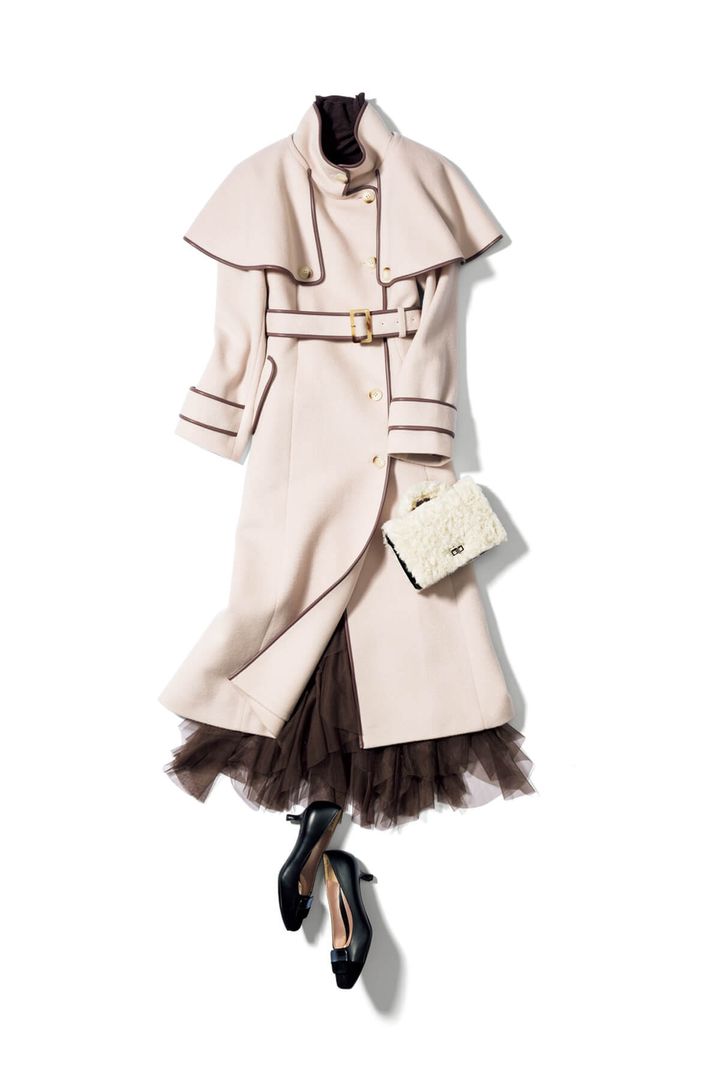今季注目株のケープコートは、華やかさときちんと感の両方を演出できるのが魅力。ベルトの着脱でも印象を変えられるので着回し力は絶大です。