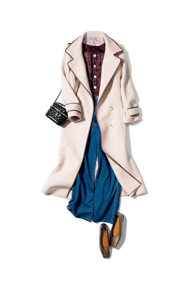 品なコートをデニムでカジュアルダウン。ツイードニットやキルティングバッグで季節感も。
