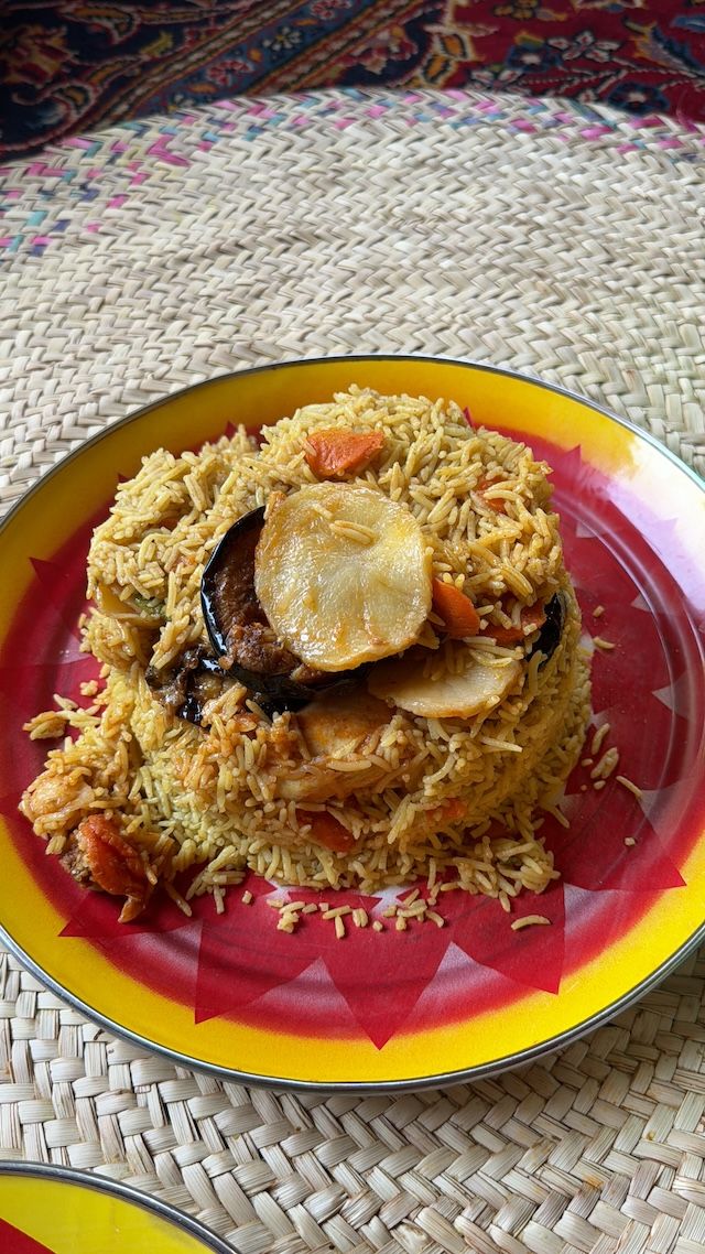 必ず頼みたいのが、カブサというホーローの中にお肉や香辛料をきかせた炊き込みご飯をつめたもの。私たちの前で提供するときは、大皿にホーローを逆さに置き、鍋を叩いて全部出すというパフォーマンスも楽しいです! その豪華な見た目から、サウジアラビアでもお祝い事に欠かせないごちそうと言われています。
