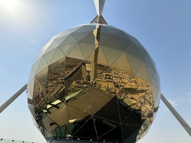 こちらも展望台があり、見学できます。筆者が訪れた際、前述したキングダムセンターの展望台が閉まっていたため、こちらへ訪れましたが、来てびっくり! 景色はもちろん素晴らしいのですが、この球体の真下に行くことができるのです。この球体は直径24mで655枚のガラス板で造られているようで、その圧倒的なデザインを見ることに価値があるのでは? と思うほど!