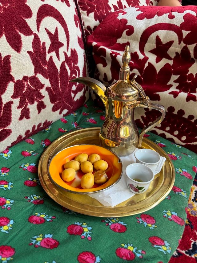 他にも、サウジアラビアではよく見かけるサウジコーヒーもオーダーしてみましょう。サウジコーヒーとは、コーヒーを黄金色になるまで煎ったもので、サフランやカルダモンというスパイスを混ぜて提供されます。スパイス多めで、私たちがよく知るコーヒーとは似ていないのですが、飲めば飲むほどやみつきに。苦みも感じるのでバランスを取るために、デーツがお供として提供されます。