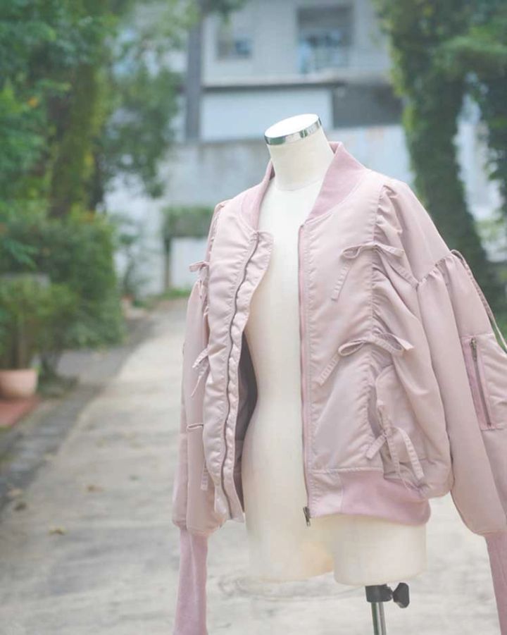 “ふわっきゅっ”なシルエットのギャザーが可愛いブルゾン。きゃしゃなリボン使いもオトナめで◎。