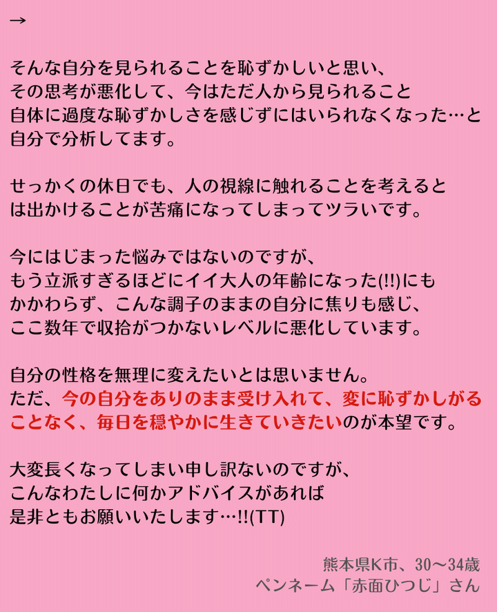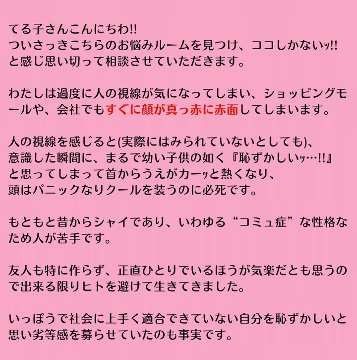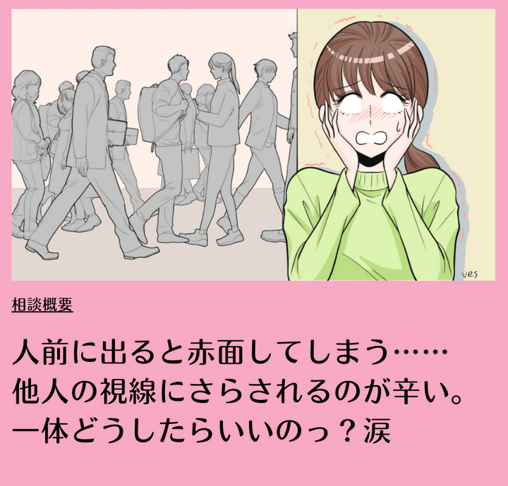 読者のお悩み:「人前に出ると赤面してしまう……他人の視線にさらされるのが辛い。一体どうしたらいいのっ!涙」