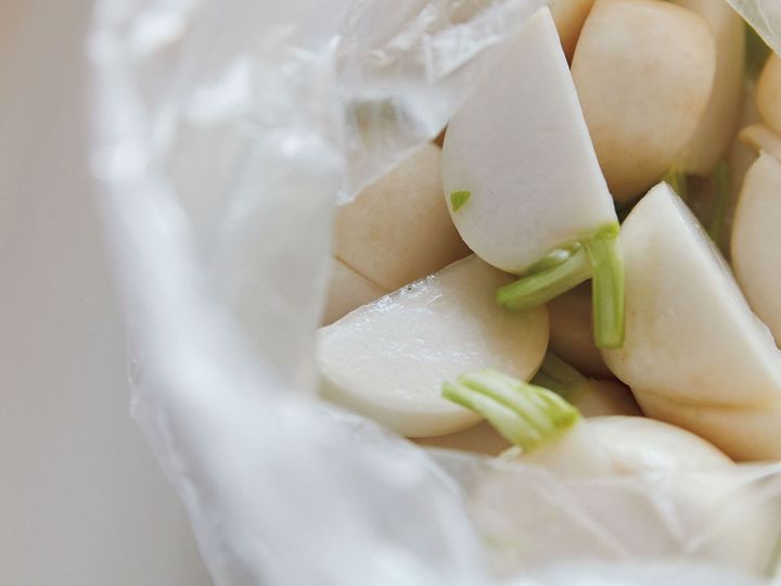 (1)かぶは茎を2cmほど残して葉を切り、茎の間の汚れを洗い流して、皮ごと6~8等分のくし形に切る。かぶの葉は長さ3cmに切る。それぞれポリ袋に入れ、塩を小さじ1/2ずつふってもみ、15分ほどおく。